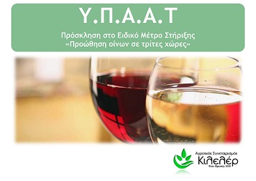 Το Υπουργείο Αγροτικής Ανάπτυξης και Τροφίμων προσκαλεί τους ενδιαφερόμενους που επιθυμούν να ενταχθούν στο Ειδικό Μέτρο Στήριξης του αμπελοοινικού τομέα «Προώθηση οίνων σε τρίτες χώρες» για την περίοδο 2019-2023, να υποβάλουν τα αιτήματά τους έως την 5η Ιουνίου 2019 στην Διεύθυνση Προώθησης Γεωργικών Προϊόντων.