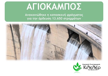 Την κατασκευή φράγματος για τη δημιουργία ταμιευτήρα νερού στην περιοχή του Αγιοκάμπου, ανακοίνωσε ο υφυπουργός Αγροτικής Ανάπτυξης και Τροφίμων κ. Βασίλης Κόκκαλης μαζί με το δήμαρχο Αγιάς κ. Αντώνη Γκουντάρα. Το έργο έχει συνολικό προϋπολογισμό 19,197 εκ. ευρώ, και αναμένεται με την ολοκλήρωσή του να αρδεύσει περί τα 13.650 στρέμματα καλλιεργούμενων εκτάσεων.