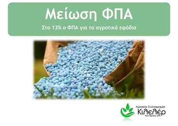 Στο μειωμένο συντελεστή ΦΠΑ 13% επιστρέφουν από σήμερα, Σάββατο 1η Ιουλίου 2017 τα περισσότερα αγροτικά εφόδια, καθώς μπαίνει σε ισχύς η σχετική διάταξη του νόμου 4472/2017.