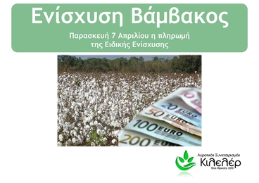 Την Παρασκευή 7 Απριλίου και εκτός απροόπτου το αργότερο την Μ.Δευτέρα 10 Απριλίου θα πληρωθεί η ειδική ενίσχυση για το Βαμβάκι, ύψους 170 εκατομμυρίων ευρώ.